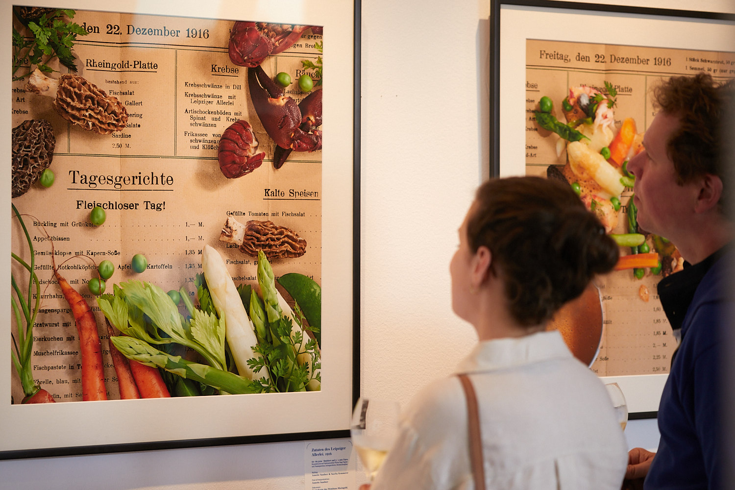 Das Motiv „Zutaten des Leipziger Allerlei. 1916“ basiert auf einer Speisekarte des Weinhaus Rheingold in Berlin vom 22. Dezember 1916. Während die angerichtete Variante des Leipziger Allerlei das fertige Gericht zeigt, werden hier die Zutaten sichtbar gemacht: Krebsscheren, Morcheln, Erbsen, Möhren, Spargel und Kerbel sind auf der historischen Karte arrangiert. Culinary Timepieces verbindet damit historische Quelle und zeitgenössische Kochkunst zu einer heutigen Interpretation. Jede Arbeit wird auf Hahnemühle Photo Rag Papier produziert, holzgerahmt mit Passepartout, nummeriert und signiert.